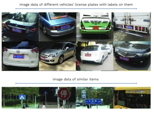 For instance, a vehicle license plate recognition system will be trained with image data with labels indicating the location (e.g., front or rear of the car) and the data format of the license plates of vehicles and similar objects to learn what to detect and what to avoid.