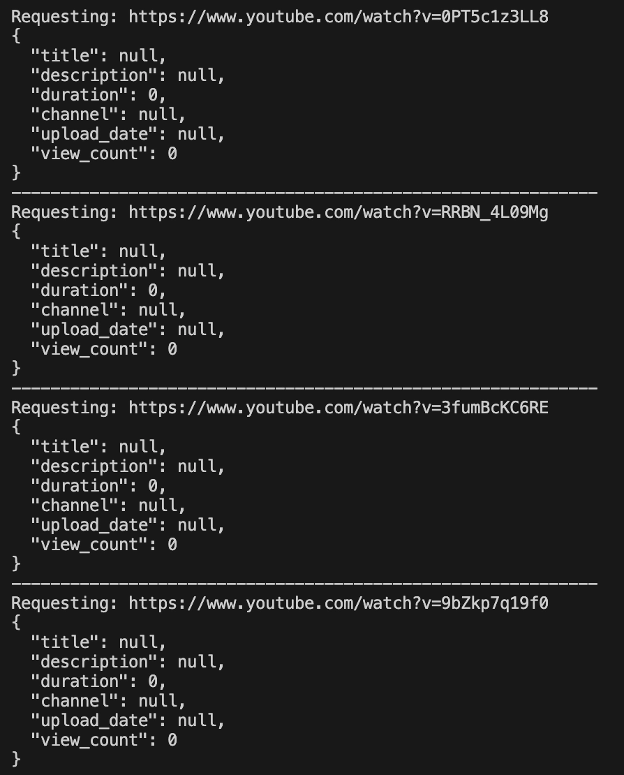 Results of scraping YouTube without using a proxy: